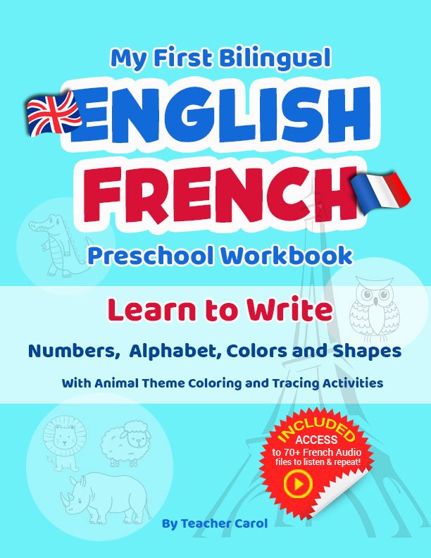After trying various apps, videos, and random library books, I finally invested in a proper bilingual workbook designed specifically for young children. My First Bilingual English / French Preschool Workbook by Teacher Carol became our daily go-to, and I genuinely cannot recommend it enough.